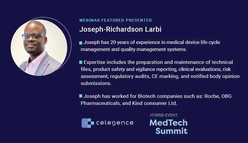 This session will be led by Celegence’s RA/QA – Medical Devices SME, Joseph-Richardson Larbi.