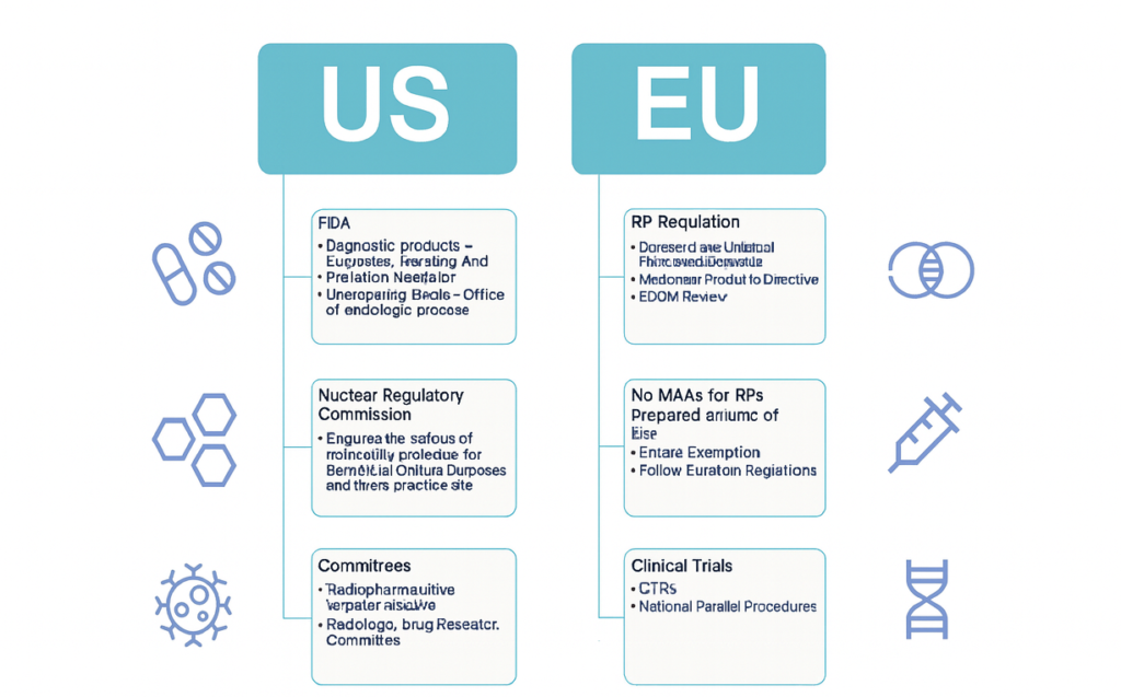 The regulatory pathway for RPs is thus defined by product type, intended use, and identified benefits and risks. Notably, different regions may have different regulatory frameworks and requirements for use of RPs (figure 3), and may even use different nomenclature: RPs are generally referred to as “radiotherapeutics” and “radiodiagnostics” in the United States and regulated by FDA and the Nuclear Regulatory Commission (NRC) In the European Union (EU) they are called “radiopharmaceuticals”, which are regulated as medicinal products.